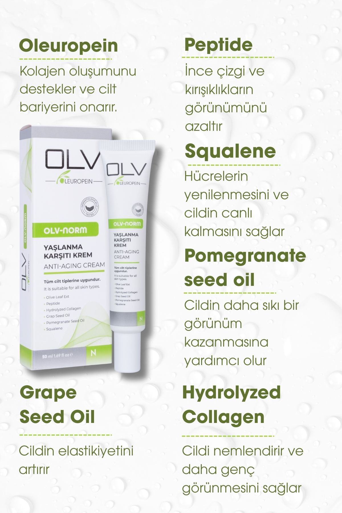 Product Information (EN): OLV Anti-Aging Cream stands out with its special formulation that offers a powerful solution against signs of skin aging. Thanks to its rich antioxidant and peptide content, it supports skin elasticity while promoting a smoother and more youthful appearance. By helping to prevent trans-epidermal water loss, it revitalizes the skin for a healthy, radiant, and renewed look.