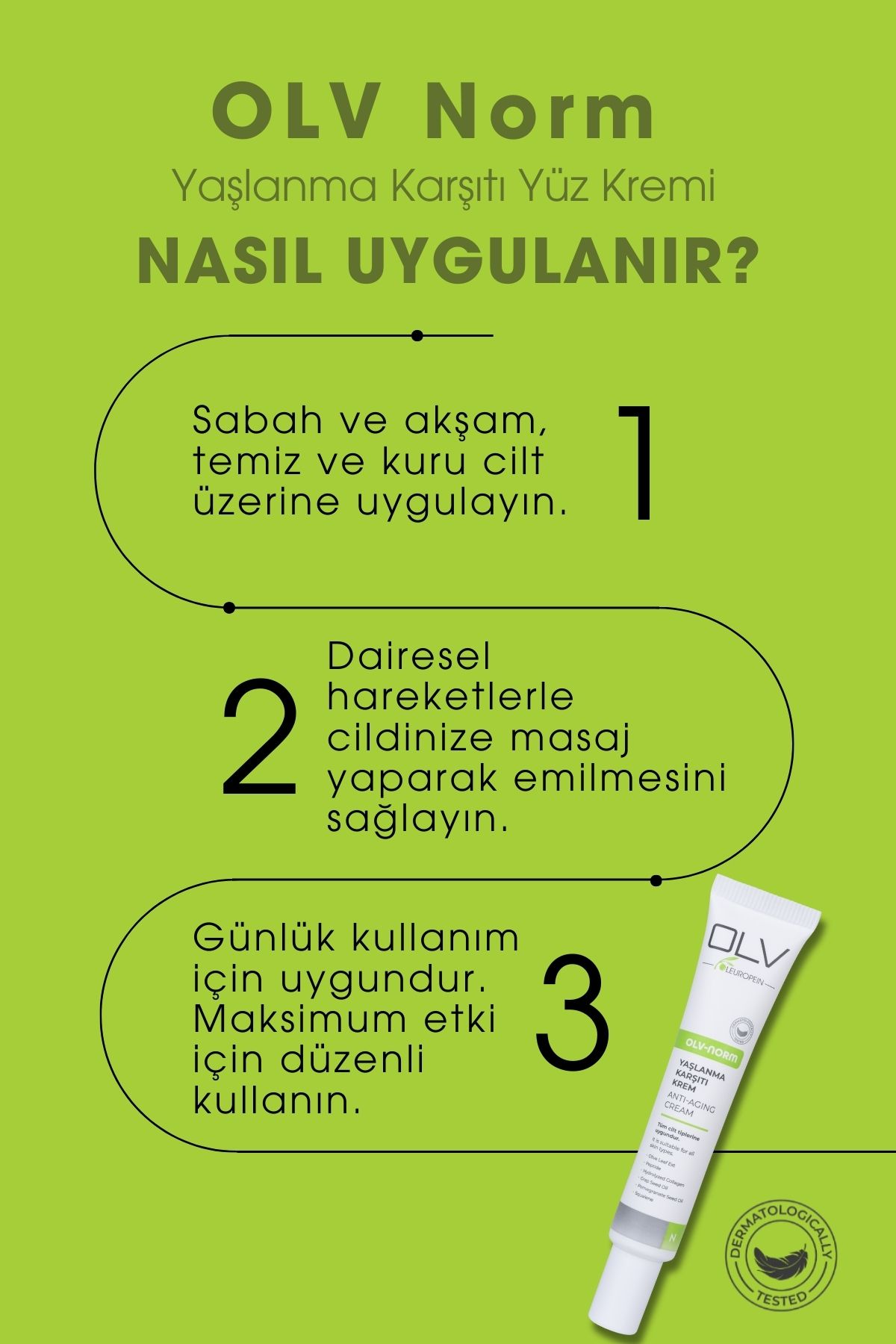 Ürün Bilgisi (TR): OLV Anti-Aging Krem, cilt yaşlanma belirtilerine karşı güçlü bir çözüm sunan özel formülasyonu ile dikkat çeker. Zengin antioksidan ve peptit içeriği sayesinde, cildin elastikiyetini desteklerken daha pürüzsüz ve genç bir görünüm sağlar. Trans-epidermal su kaybını önlemeye yardımcı olarak, cildi canlı, sağlıklı ve yenilenmiş bir görünüme kavuşturur.
